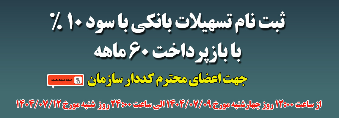 ثبت نام تسهیلات ۱۰۰ ملیون تومانی با نرخ سود ۱۰ % و بازپرداخت ۶۰ ماهه جهت اعضا کددار سازمان