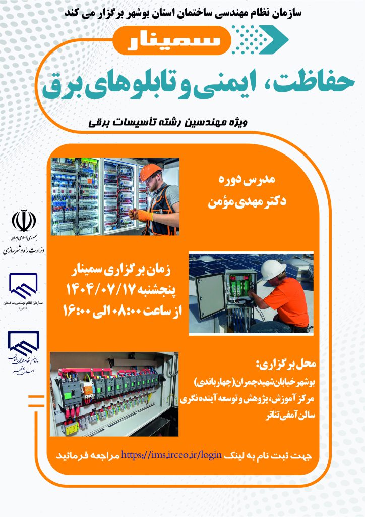 سمینار “حفاظت، ایمنی و تابلوهای برق” در روز پنجشنبه مورخ 1404/07/17 از ساعت 08:00 الی 16:00 با تدریس آقای مهندس مهدی مؤمن در سالن آمفی تئاتر مرکز آموزش و پژوهش های توسعه وآینده نگری واقع در خیابان شهید چمران، برگزار می گردد. لذا از مهندسین محترم رشته تأسیسات برقی دعوت بعمل می آید از طریق مراجعه به لینک ذیل نسبت به ثبت نام اقدام نمایند.