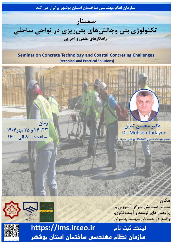 سمینار “تکنولوژی بتن و چالش های بتن ریزی در نواحی ساحلی(راهکارهای علمی و اجرایی)” در روزهای چهارشنبه،پنج شنبه و جمعه مورخ 24،23 و 1404/07/25 از ساعت 08:00 الی 16:00 با سخنرانی آقای دکتر محسن تدین در سالن همایش مرکز آموزش و پژوهش های توسعه و آینده نگری واقع در خیابان شهید چمران، برگزار می گردد. لذا از مهندسین محترم رشته های عمران و معماری دعوت بعمل می آید از طریق مراجعه به لینک ذیل نسبت به ثبت نام اقدام نمایند.